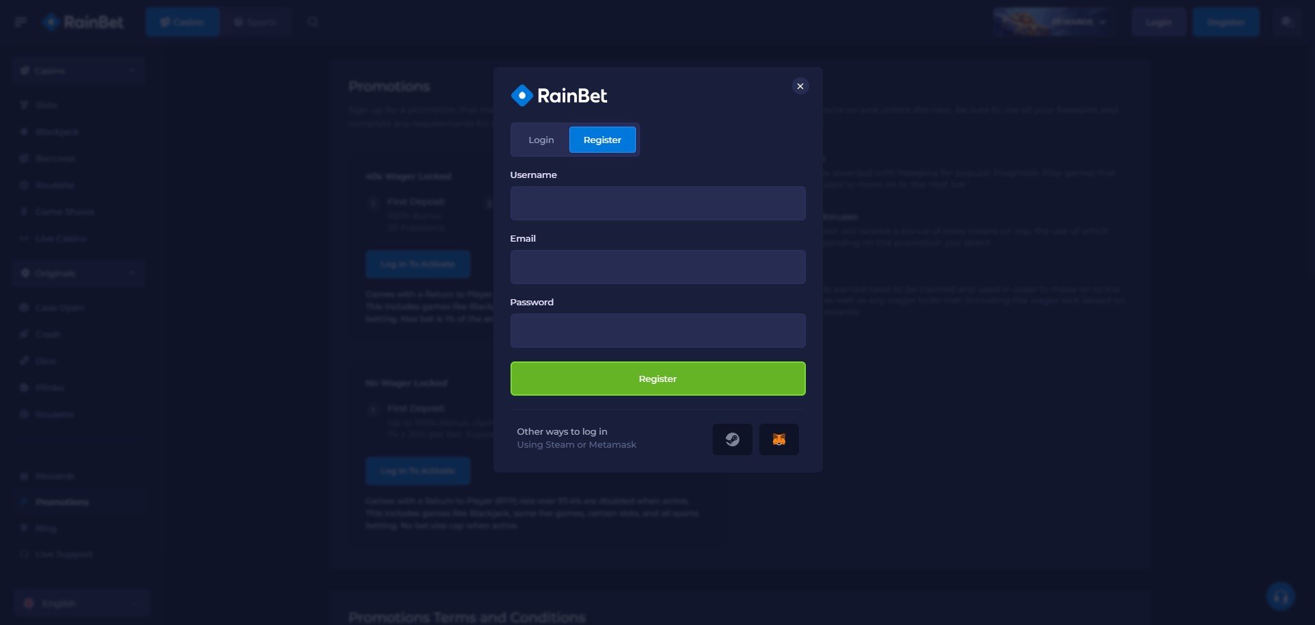 Once you get on the web page, you can register using Metamask or Steam.More Here rainbet demo At our site So, if you have an account with either alternative, you can finish the procedure within a couple of mins. If you don’t, you can finish the registration the old-fashioned method by utilizing your active email address.